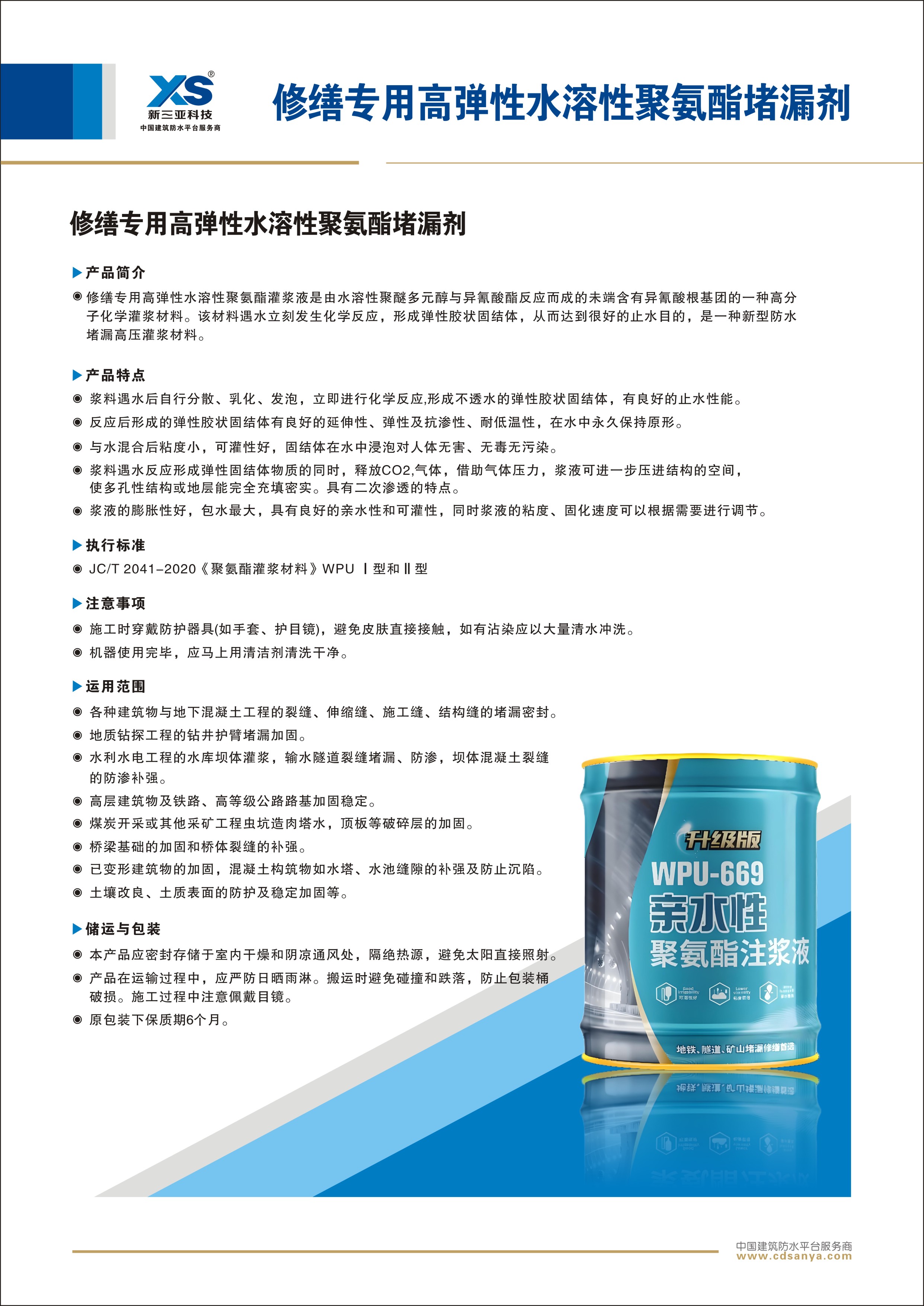 產(chǎn)品簡介: WPU-669水溶性聚氨酯灌漿液是由水溶性聚醚多元醇與異氰酸酯反應(yīng)而成的未端含有異氰酸根基團的一種高分子化學(xué)灌漿材料。該材料遇水立刻發(fā)生化學(xué)反應(yīng),形成彈性膠狀固結(jié)體,從而達到很好的止水目的,是一種新型防水堵漏高壓灌漿材料。 規(guī)格型號: 按產(chǎn)品性能分為Ⅰ型和Ⅱ型 包裝: 7kg/桶 | ![]() |